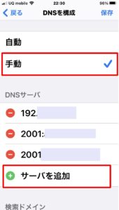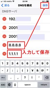 もう一度「+サーバーを追加」をタップして「1.1.1.1」を入力し「保存」をタップします。