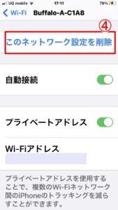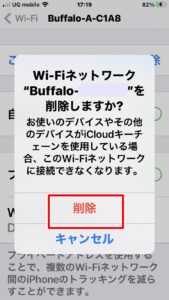 ・「Wi-Fiネットワーク”ご利用中の ”SSID名” を削除しますか?」とでたら削除をタップします。