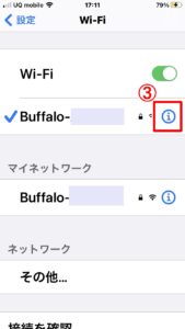 ・ご利用中のSSID(電波)の右側「iマーク」を開きます。