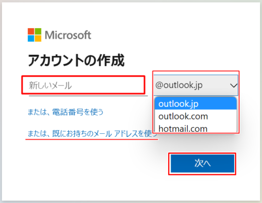 ※gmailやyahooメールなど、すでに持っているアドレスをMicrosoftアカウントとして登録することもできます。この場合は、Outlookメールの送受信はできないのでご了承くださいね(^^♪