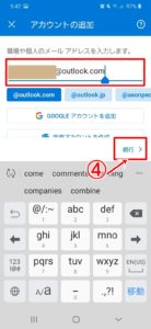 ③「アカウントの追加」と出るので設定したいメールアドレスを入力し「続行」をタップします。