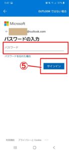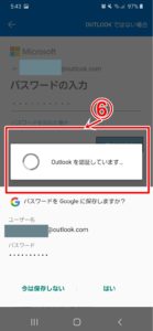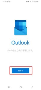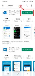 ①PlayストアからOutlookを検索し「インストール」をタップ。
