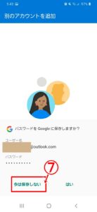 ⑦「パスワードをgoogleに保存しますか?」と出た場合は「後で」「今は保存しない」を選択してください。