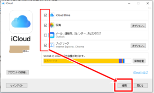 のうちから、パソコンとiCloudドライブで同期したい項目にチェックを入れて「適用」を押します。