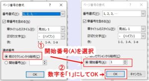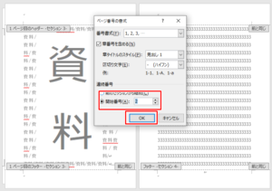 ・「開始番号」にチェックを入れ、右側の数字を「2」になおして「OK」をクリック