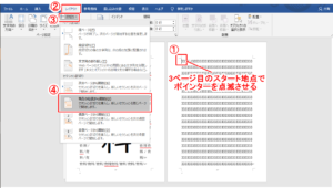 ・レイアウト > 区切り > 現在の位置から開始 の順でクリックします。
